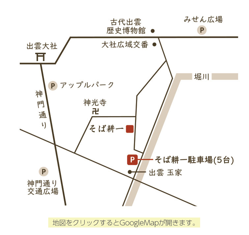 そば耕一の営業時間に限り出雲玉家さんの駐車場に駐車できます。(入口から5台)満車の場合は神門通り周辺の駐車場をご利用ください。
